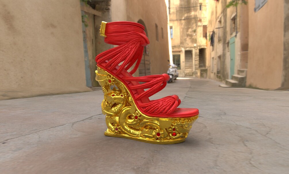 Rich, crimson silk straps wrap elegantly around the foot, creating a look of pure power and luxury.