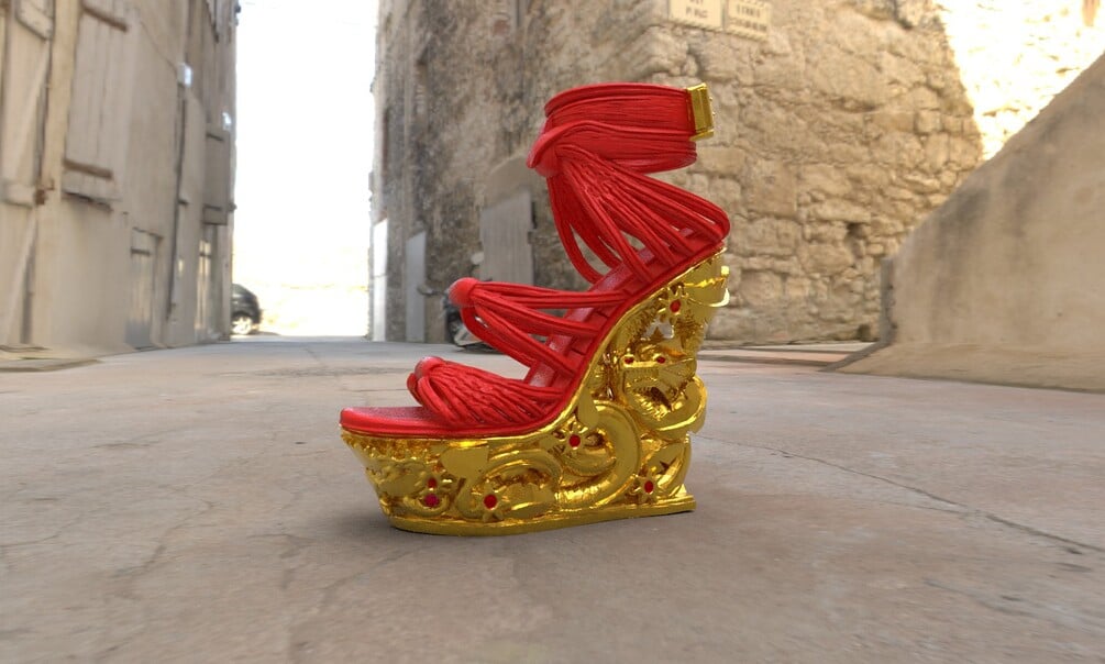 Rich, crimson silk straps wrap elegantly around the foot, creating a look of pure power and luxury.