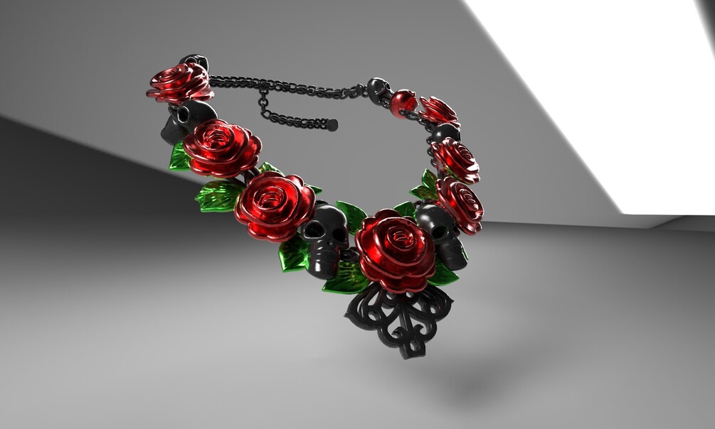 A statement piece that intertwines life and mortality with defiant beauty. The Fatal Bloom Choker features a garland of metallic fuchsia roses and vibrant leaves sprouting from polished onyx skulls, all linked by a blackened chain.
