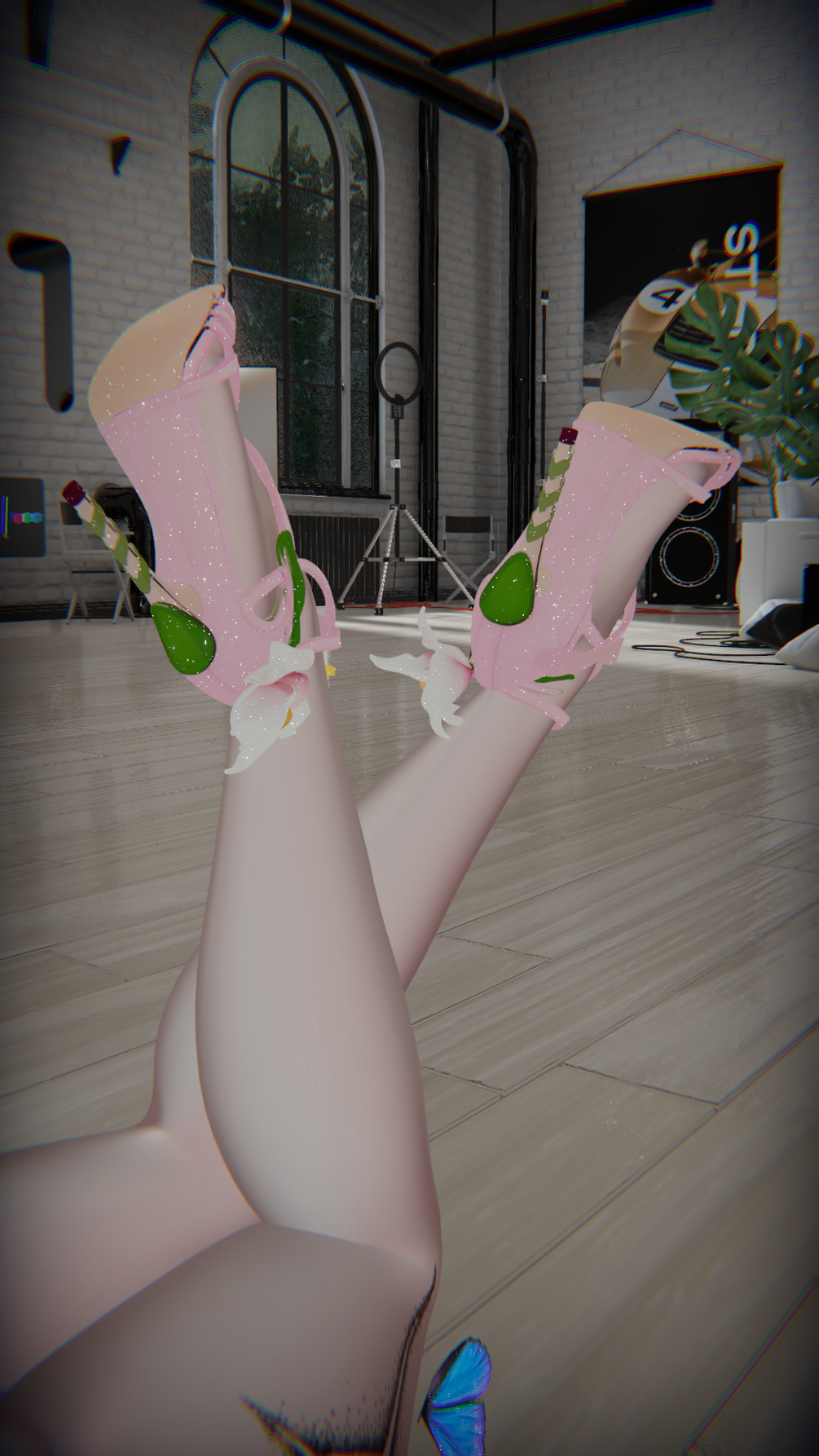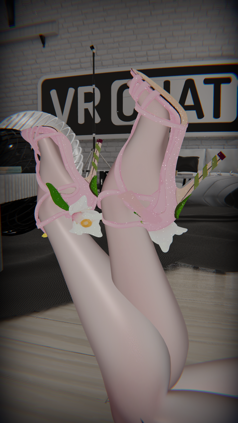 They are designed to bring the delicate beauty and grace of nature to your avatar's look. Featuring exquisite, winding straps in a soft, enchanting purple pink, these high heels are adorned with a beautiful white flower and vibrant green leaves wrapping around the ankle and heel.